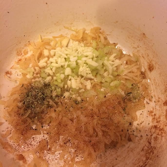 Добавить чеснок, сельдерей, орегано и корицу. Перемешать и тушить 2-3 минуты.