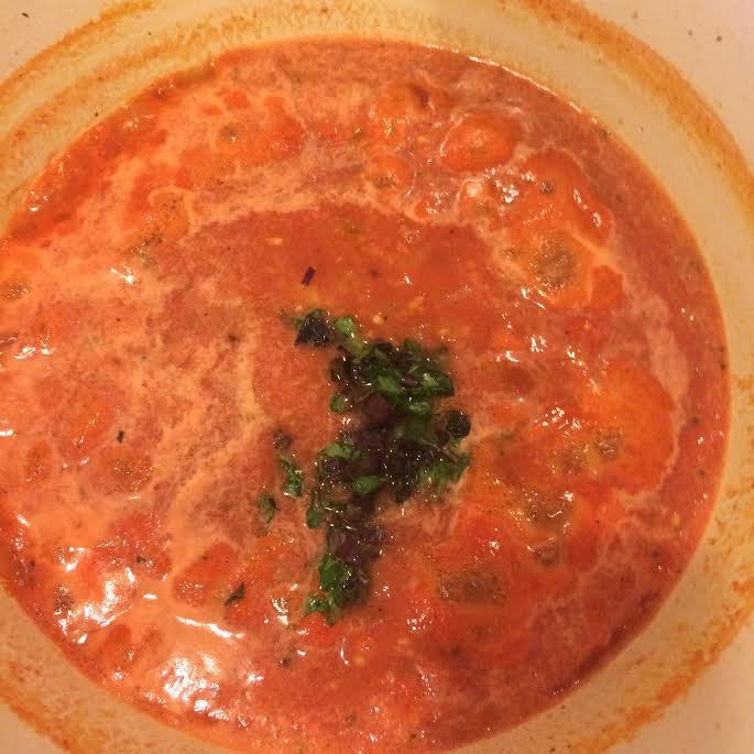 Помидоры очистить, измельчить в фуд-процессоре, добавить в кастрюлю. Добавить базилик, соль, перец, перемешать и довести до кипения.