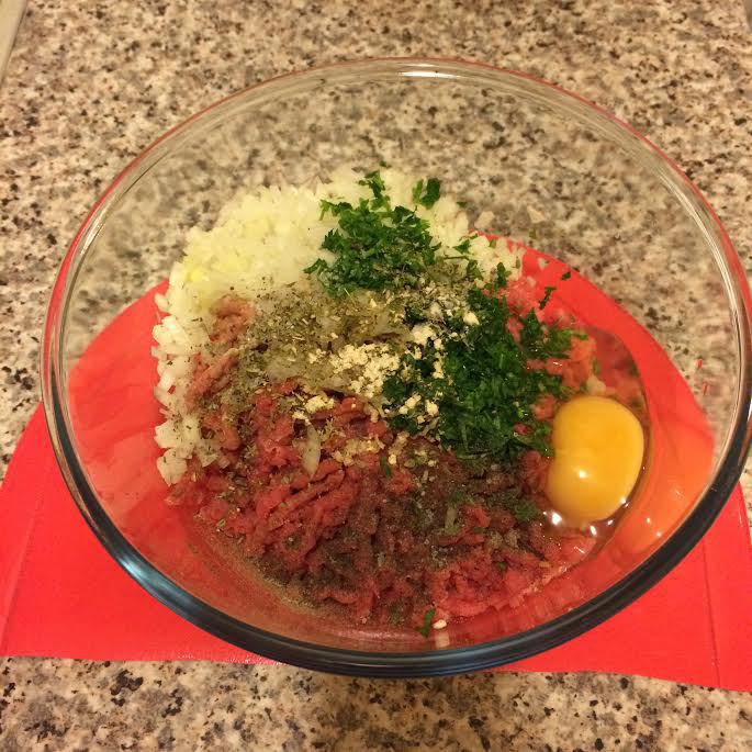 Лук и петрушку мелко нарезать. В фарш добавить лук, петрушку, хлебную крошку, яйцо, орегано, соль, перец, чесночный порошок и хорошо перемешать.