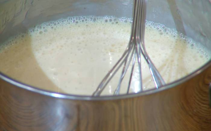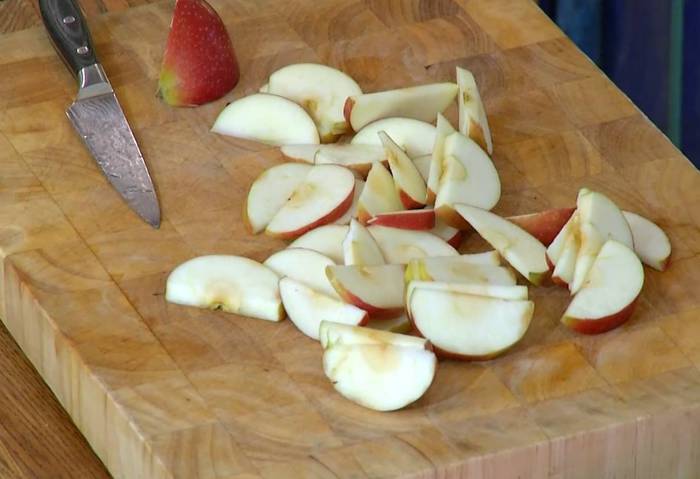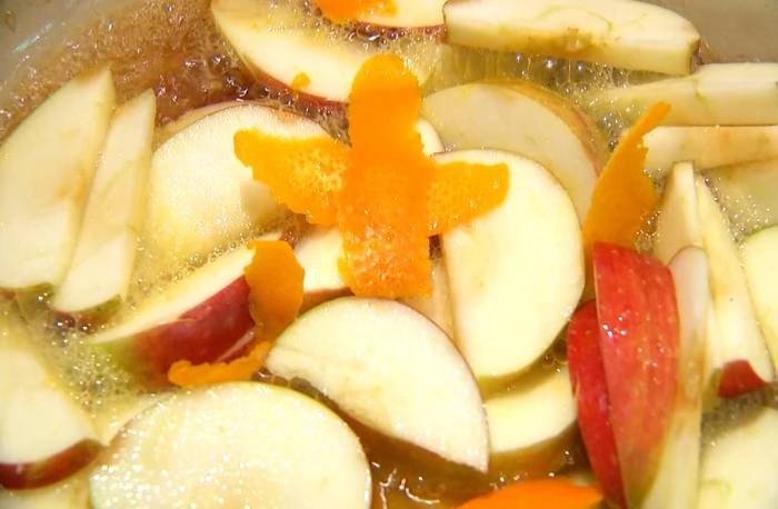 Приготовить соус: в сковороду всыпать оставшийся сахар, добавить яблочные дольки, апельсиновую цедру, влить апельсиновый сок и имбирный напиток и прогревать все на медленном огне, так чтобы яблоки закарамелизировались.