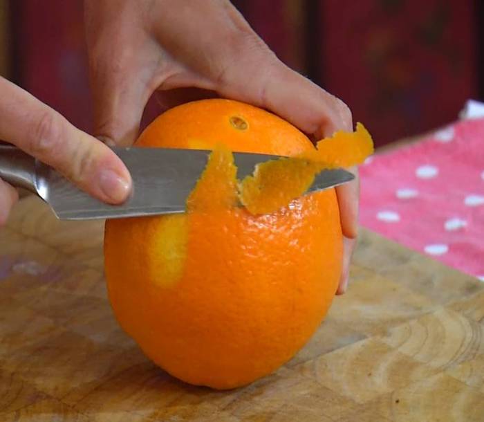 С половинки апельсина срезать ножом цедру и выжать сок.