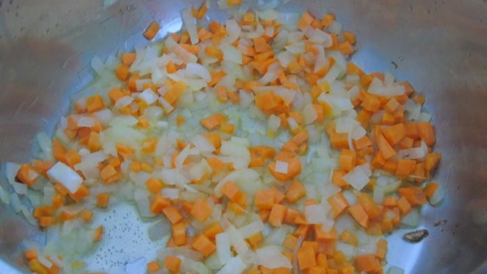 Морковь нарезать кубиками, лук и чеснок мелко измельчить. Перец чили освободите от семян и нарежьте. Разогреть растительное масло и припустить лук, чеснок, чили и морковь.