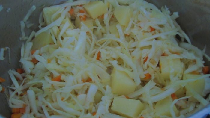 Добавьте к овощам нашинкованную капусту, потушите еще 5 — 7 минут. Добавьте карри, соль, перец и влейте воду. Как закипит, варите минут 7 — 10.