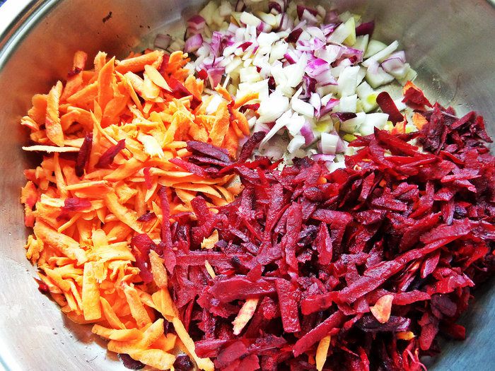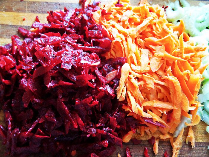Заранее моем, чистим овощи и натираем на крупной терке морковь и свеклу.