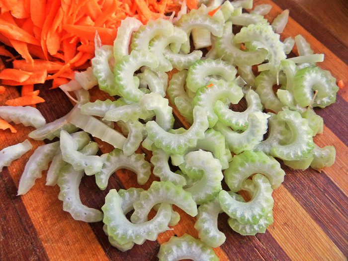 Сельдерей шинкуем на кусочки, он понадобится в последнюю очередь. Если брать корень, то обжаривать одновременно с верхними овощами.