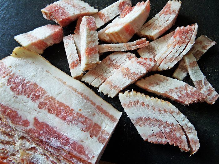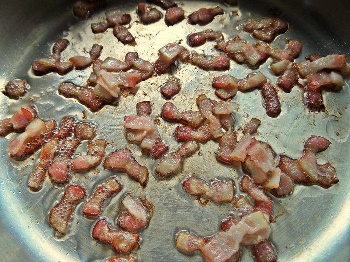 Это блюдо можно готовить на масле или на жирке от бекона, который у меня всегда есть в морозилке. Его очень легко мелко настрогать, например, для утренней яичницы.