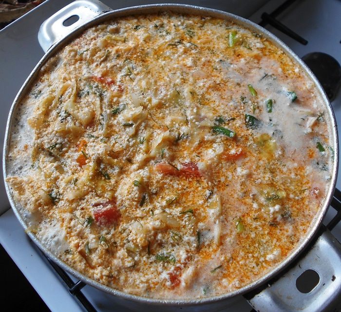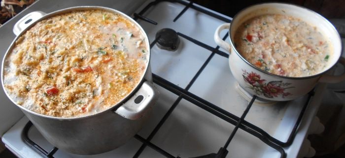 Так как жидкости в кастрюле мало, часть овощей перекладываем в маленькую кастрюльку (сразу поесть), мелко режем настоящий плавленный сыр (я взял каратовский с грибами) в миску, наливаем туда сливки, разбиваем яйца, взбиваем блендером и разливаем по кастрюлям, я добавил немного воды.