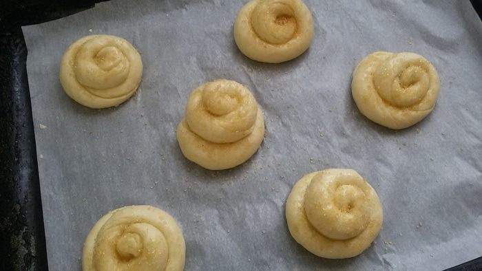 Выложить булочки на противень, застеленный бумагой для выпечки, смазать слегка взбитым яйцом и посыпать спирали и узелки тростниковым сахаром.Выпекать в предварительно нагретой духовке при температуре 190°C 15- 20 минут. Приятного аппетита!