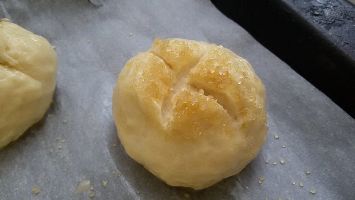 Сформировать круглую булочку, обмакнуть в тростниковый сахар и разрезать крест-накрест.