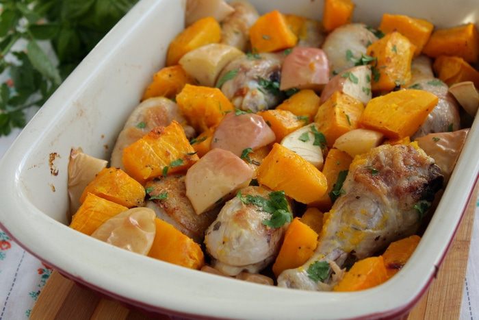 Нарезать ломтиками, уложить в форму, посыпать солью, перцем и сбрызнуть оливковым маслом, добавить тимьян.Поставить форму в духовку, разогретую до 180°C, и запекать тыкву около 10 — 15 минут до полуготовности.