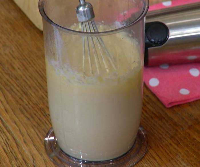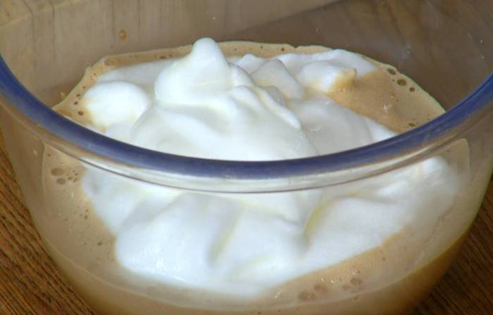 Белки взбить блендером с насадкой-венчиком в пену, ввести в молочно-желтковую массу и вымешать все венчиком.