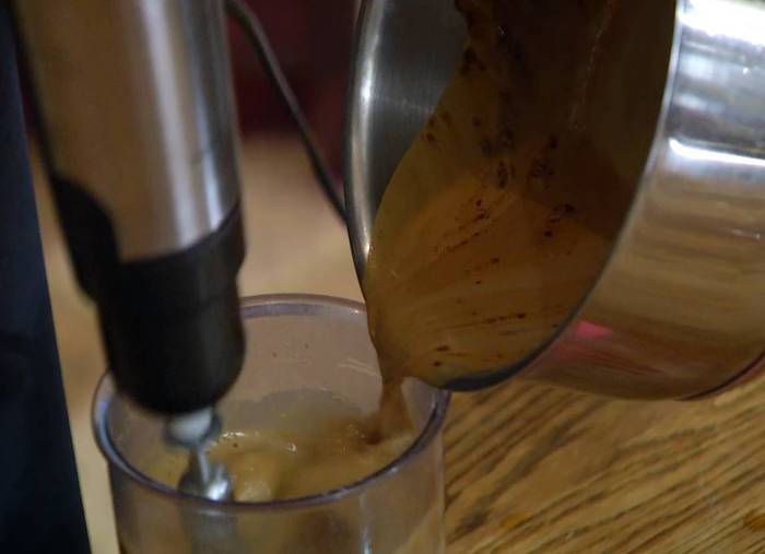 Продолжая взбивать, медленной струйкой влить горячее молоко с кофе — должна получиться однородная масса.