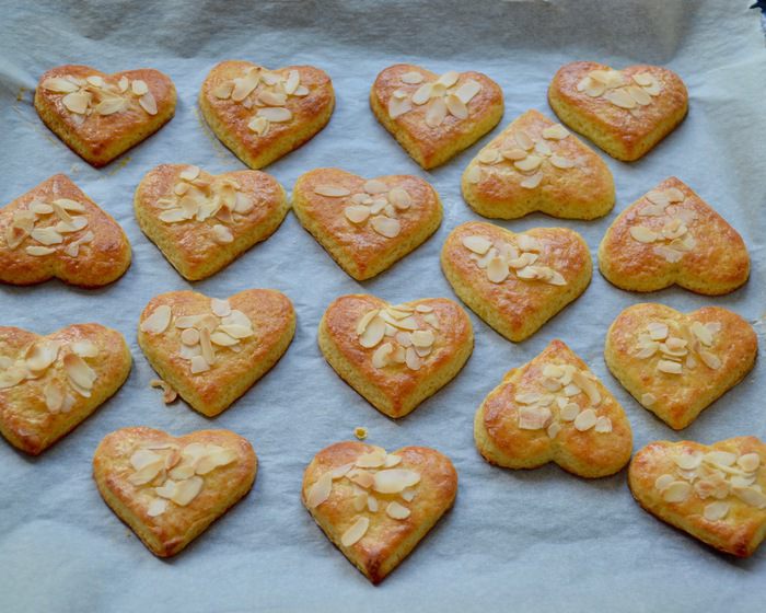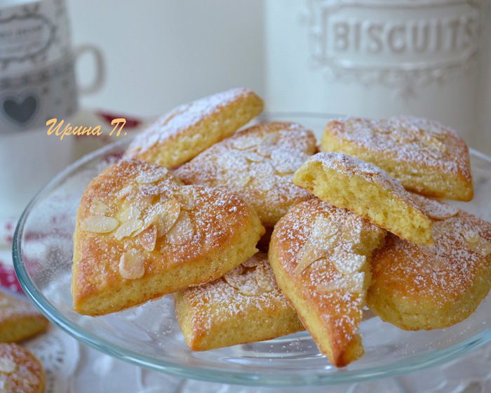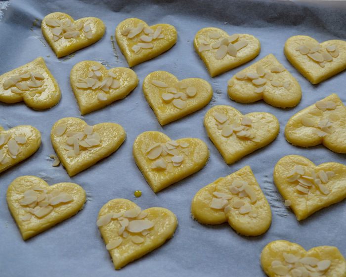 Выложить печенье на застеленный пекарской бумагой противень на небольшом расстоянии друг от друга (печенье в процессе выпечки увеличится в размере), смазать взбитым яйцом и посыпать миндальными лепестками.