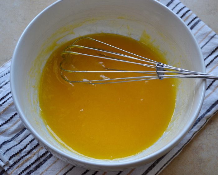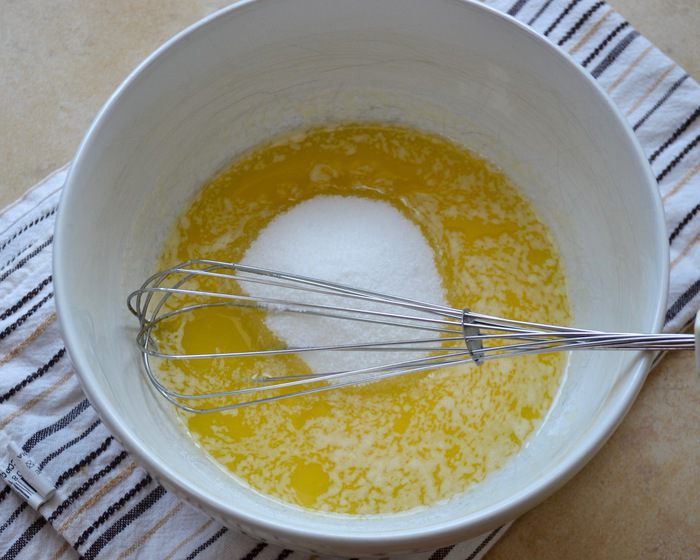 Растопить сливочное масло, перелить в миску и добавить сахар. Размешать.