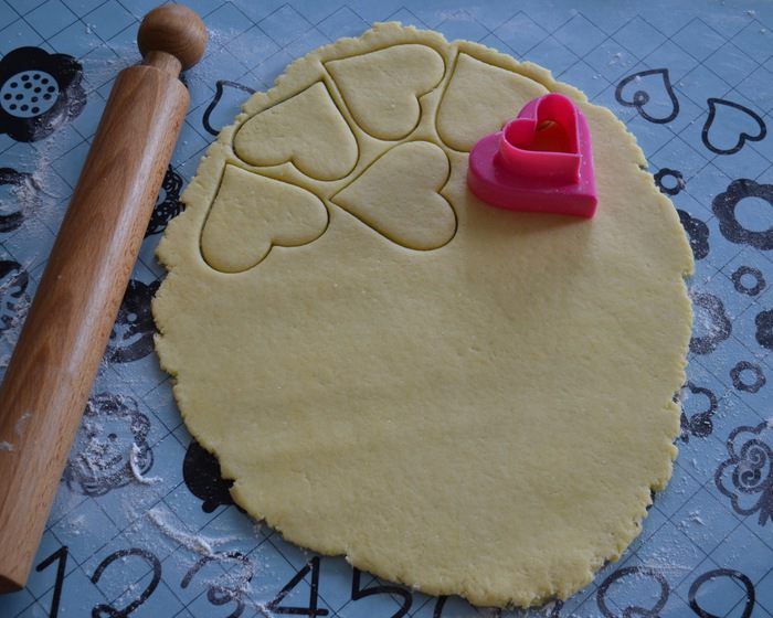 Тесто удобно поделить на две части. По очереди раскатать каждую часть теста (на припыленной мукой поверхности!) в пласт толщиной около 5 — 7 мм. Вырезать печенье любой формы.