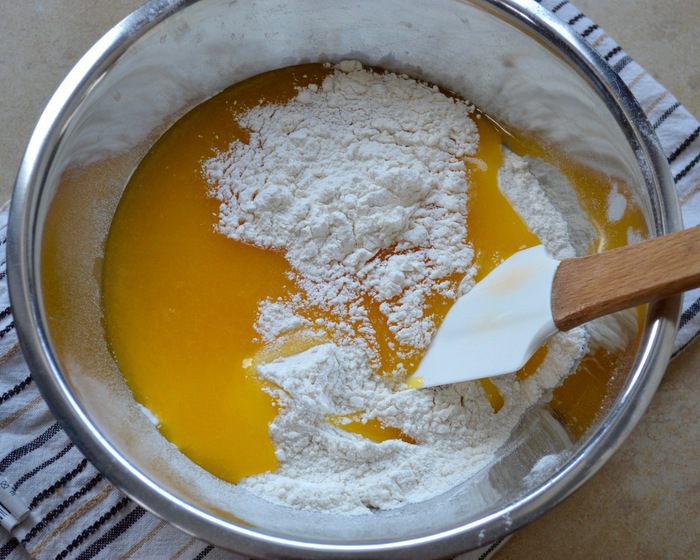 Отдельно в миску просеять пшеничную и рисовую муку, добавить соду и соль. Смешать обе смеси.