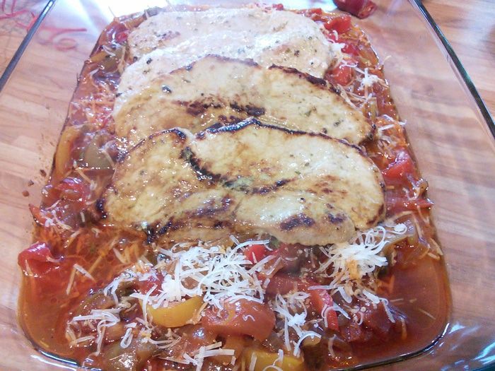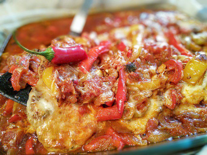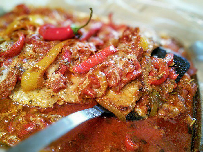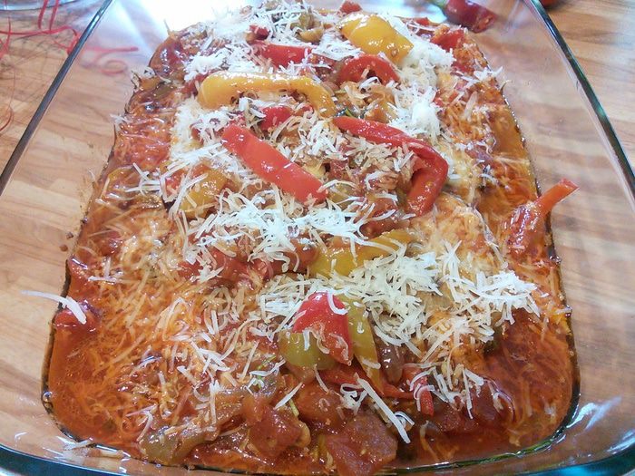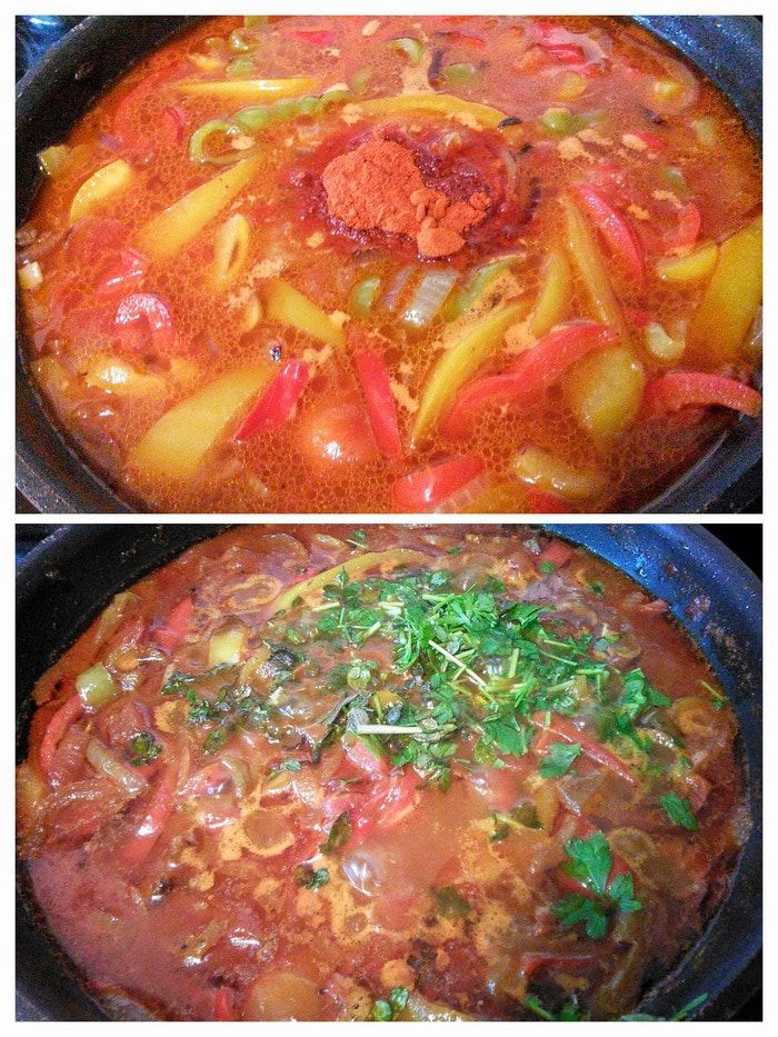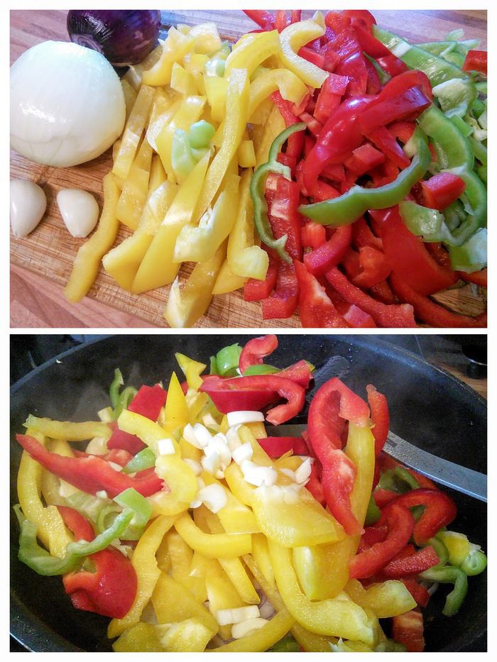 Перец болгарский (желательно разных цветов) помыть, очистить от семян и перепонок, нарезать полосками. Лук очистить и тоже нарезать полукольцами. На сковороде разогреть масло и обжарить перец и лук, мелко порубленный чеснок, посолить и поперчить, добавить майоран и перец чили.