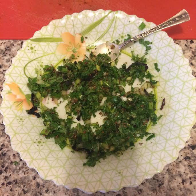 Начинка: кинзу, базилик мелко порубить, добавить зеленый лук, чеснок, горчицу, майоран и 1 ст. л. оливкого масла, перемешать.