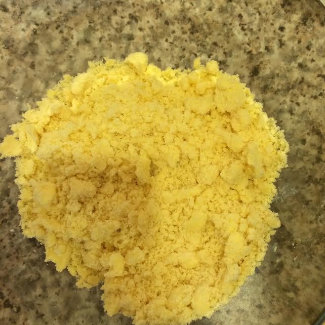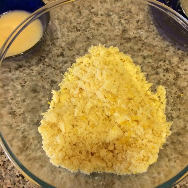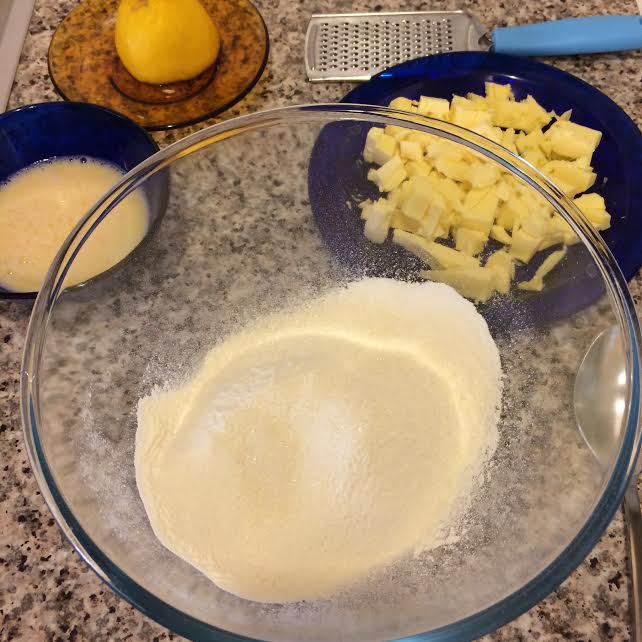 Добавить кубики холодного сливочного масла и перетереть в крошку. Добавить сок лимона и цедру.