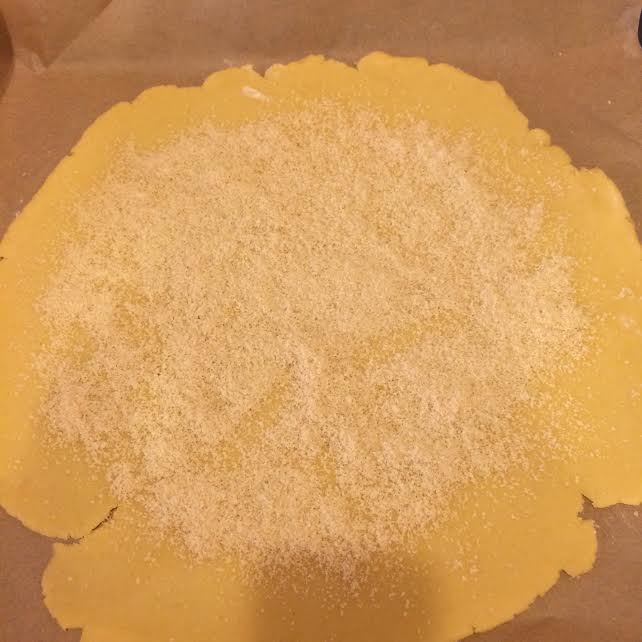 Тесто раскатать 30 см на коврике для выпечки или на пекарской бумаге, посыпать миндальной мукой.