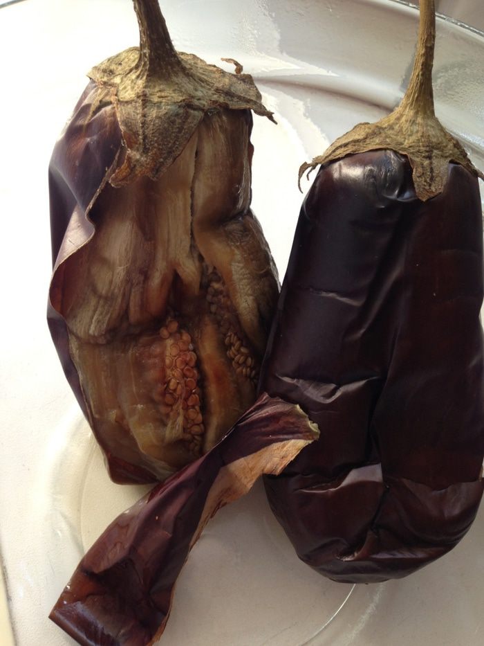 Баклажаны запечь при 180°С 15 — 20 минут до мягкости. Очистить от кожицы и порубить кубиками. Приправить солью и перцем, добавить рубленую зелень и чеснок. Перемешать.
