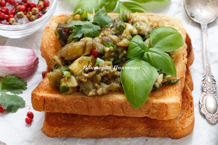 На одну порцию — 2 кусочка хлеба и один средний баклажан.