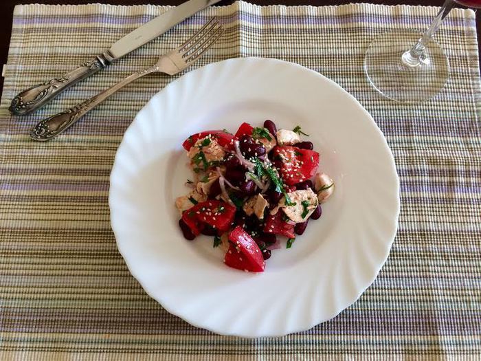 добавить масло, уксус, соль, перец и аккуратно перемешать. Дать настояться 5 минут.