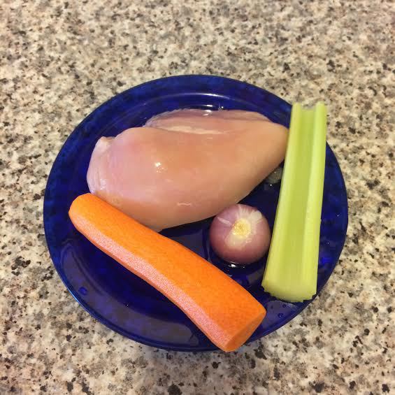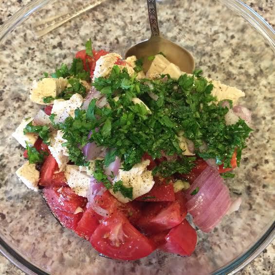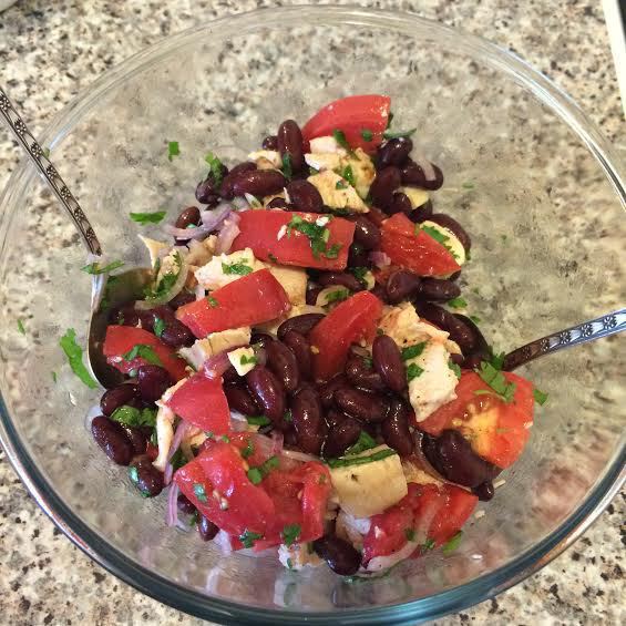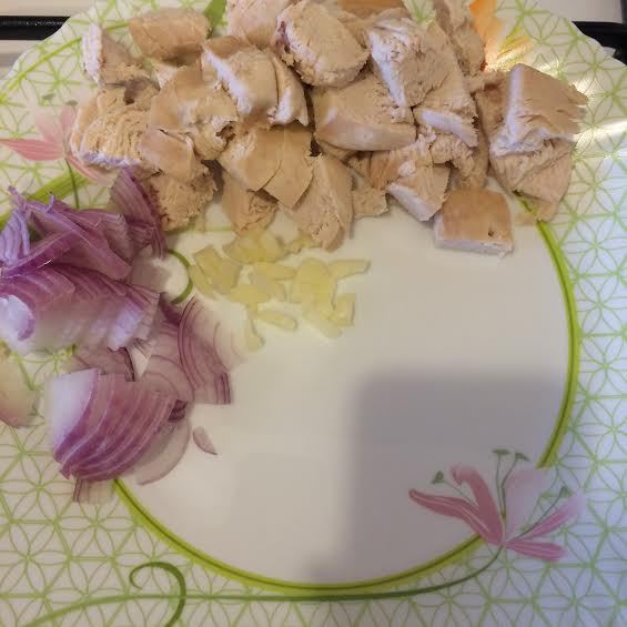 Курицу, лук и чеснок нарезать и добавить в салат.