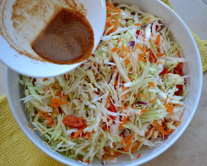 Добавить к специям уксус, воду и как следует перемешать. Добавить заправку в салат.