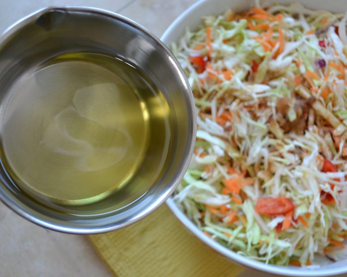 Тем временем раскалить на огне растительное масло (я использую в этом салате масло виноградных косточек).