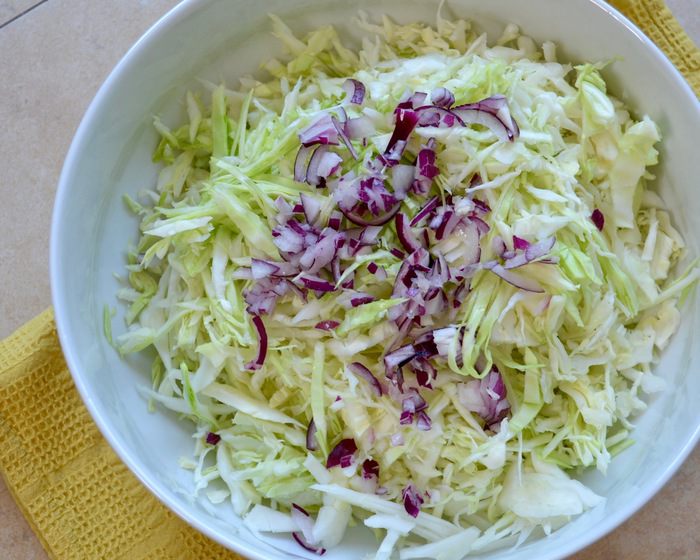 Я еще от себя добавляю в салат немного красного лука — половинку небольшой луковицы (по желанию).