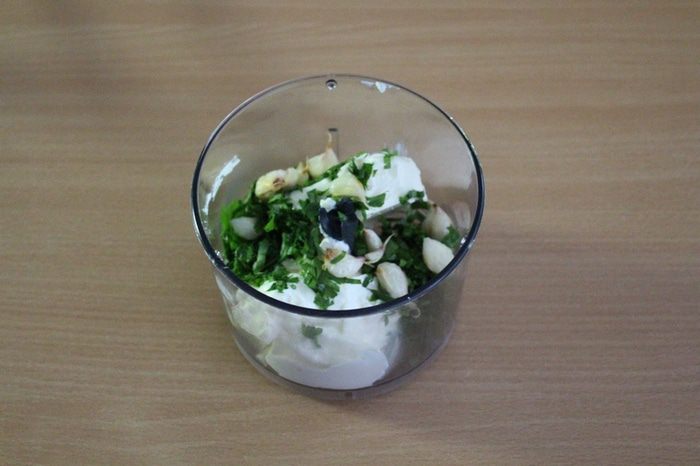 Для соуса: измельчить зелень, в духовке запечь головку чеснока, добавить сметану, сливочный сыр, взбить блендером.