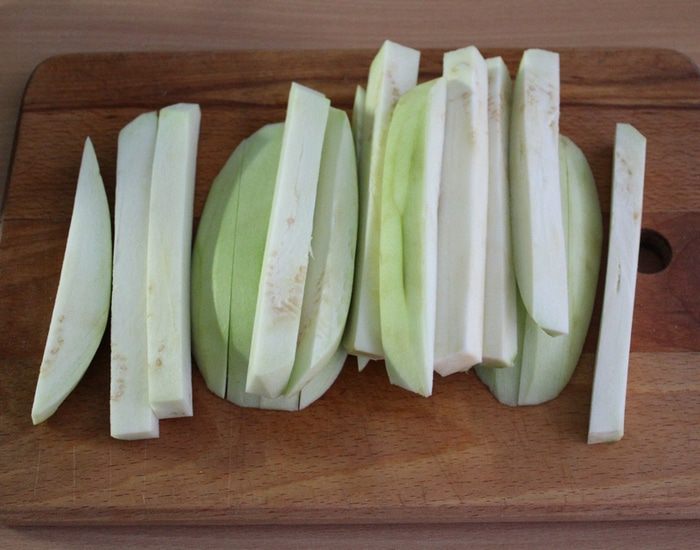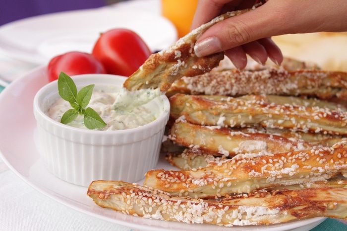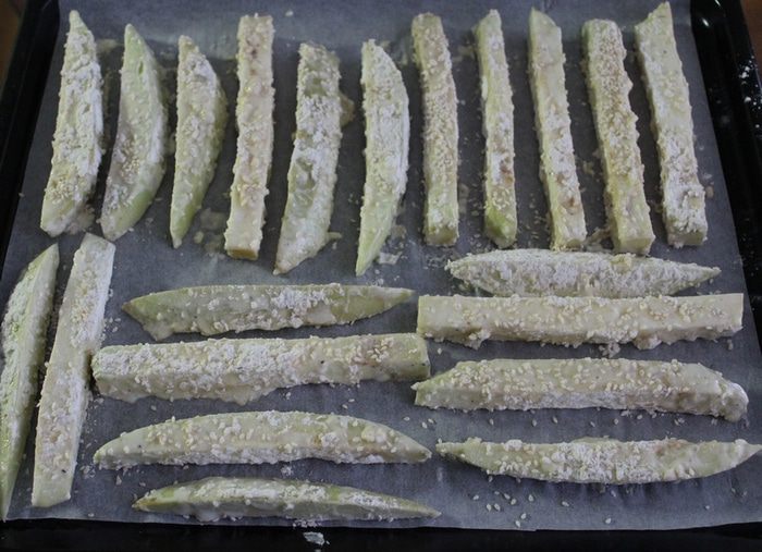 Баклажаны сперва обмануть с яично-сметанную смесь, затем обвалять в муке и кунжуте. Выложить на противень, покрытый бумагой для выпечки.