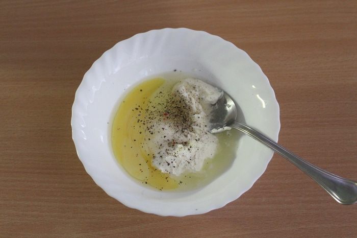 В тарелке смешать сметану, яйцо, соль, перец по вкусу, перемешать.