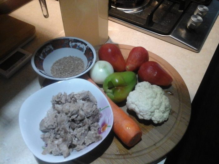 Перво-наперво я сварила бульон: суповая часть индейки, вода, приправы на вкус хозяйки и плита. Индейка готовится быстро, поэтому через 15 — 20 минут бульон готов. Разделываем мясо, при необходимости процеживаем бульон (у меня получилось примерно 1 — 1,2 литра). Подготавливаем овощи.