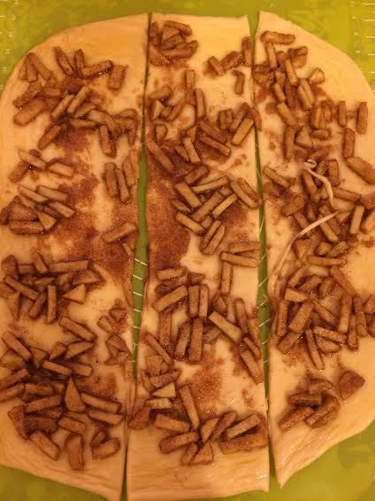 Сверху выложить начинку. Разрезать на 3 полоски.