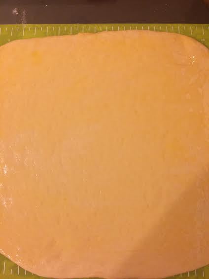 Раскатать тесто в пласт. Я выпекаю в форме 30/11, поэтому тесто раскатала таких размеров — 30/40. Тесто смазать растопленным маслом.