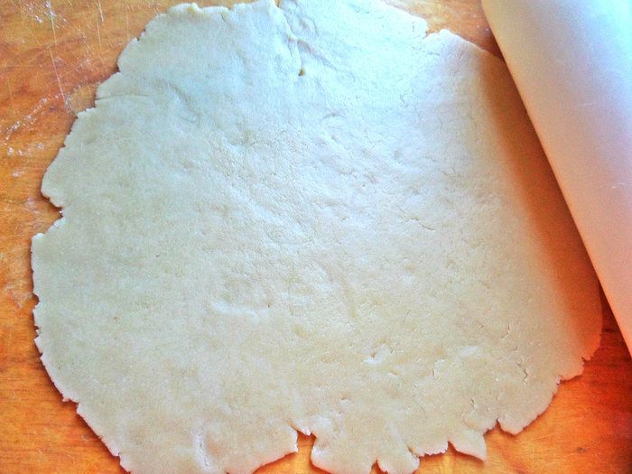 Перенести в форму и прижать к форме с бортиками. Края обрезать. Наколоть дно вилкой.
