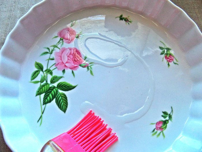 Керамическую форму смазать растительным маслом. Дно моей формы диаметром 22 см, борта высотой 3 см, ширина верха 24 см.