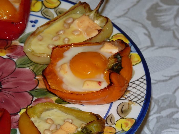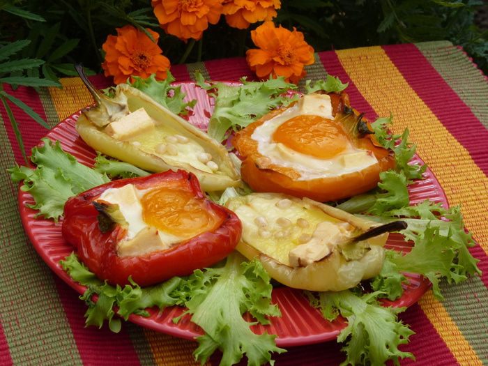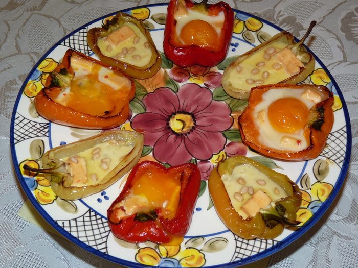 Затем «сырные лодочки» посыпать орешками, а в остальные аккуратно влить по одному яйцу (для этого блюда лучше всего подходят перепелиные яйца, но у меня их не было).