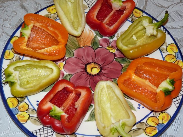 Болгарский перец вымыть, разрезать вдоль на две половины. Очистить от семян и перепонок.