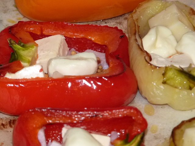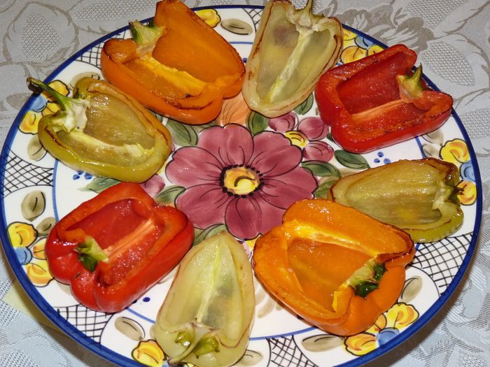 На лист духовки растелить бумагу для выпечки. Смазать оливковым маслом и выложить перцы срезом вниз. Выпекать в заранее разогретой до 180°С духовке 5 мин., Затем перевернуть и запекать 3 минуты.