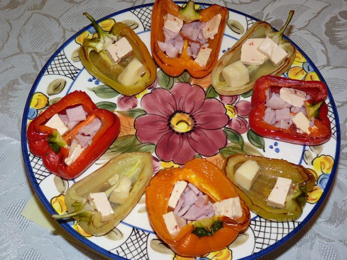 Разделить на две части — одни будут с сыром, другие с ветчиной, сыром и яйцами. В каждую «сырную лодочку» выложить по кусочку плавленого и твердого сыра. В «лодочки с яйцом» выложить по пару кусочков плавленого сыра, измельченную ветчину и горчицу.