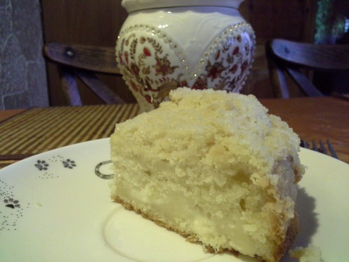 сверху творог (я выкладывала по ст. л., ровным слоем не получится, т. к. тесто жидковатое).