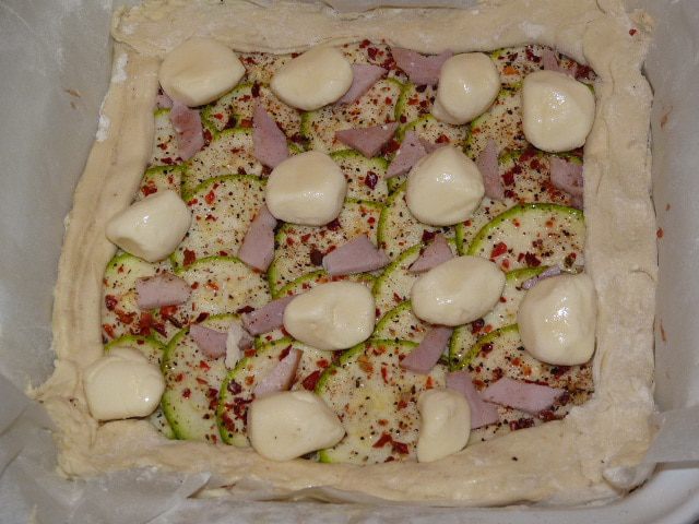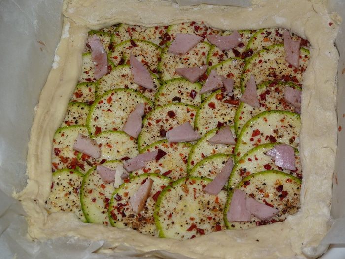 Из оставшегося теста сформировать бортики. Ветчину измельчить и выложить сверху.
