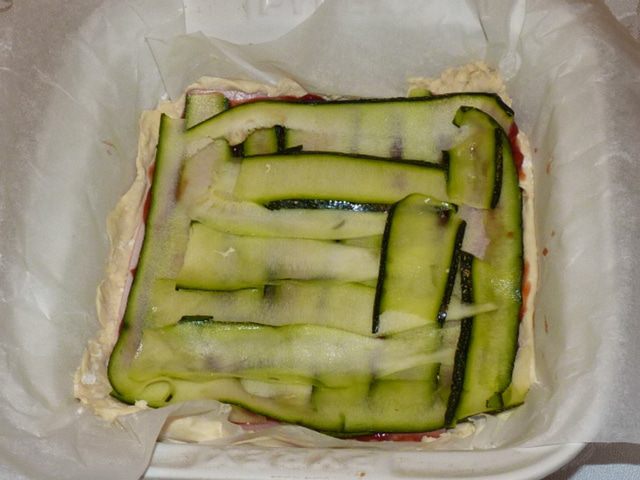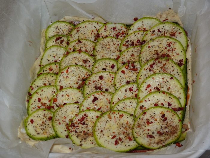 Один цукини нарезать тонкими пластинами и выложить сверху. Посолить.