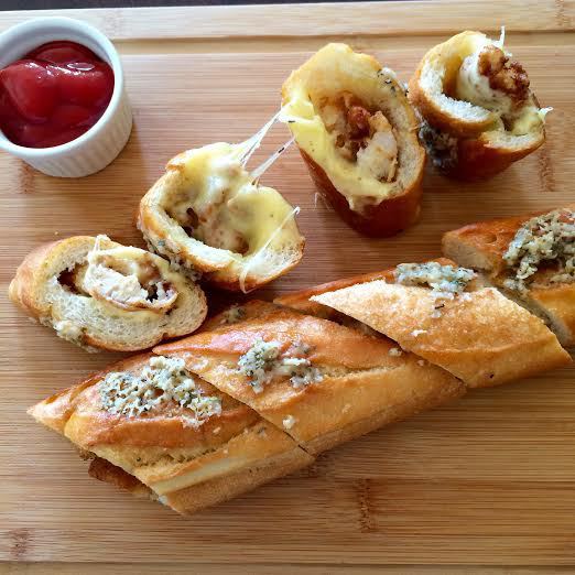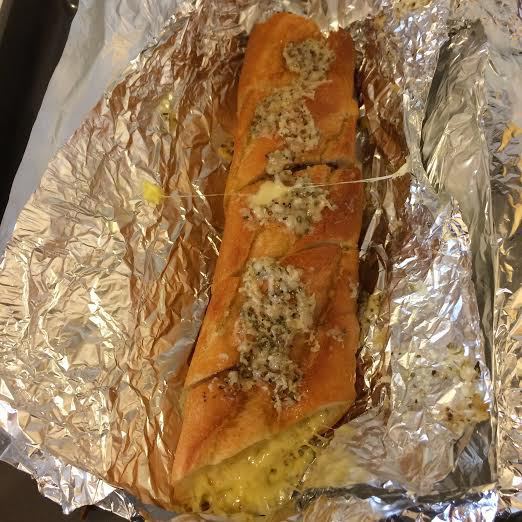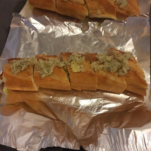 Багеты выложить на фольгу, нарезать на порционные куски. Сверху выложить смесь из пармезана.