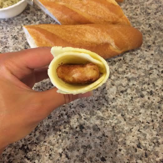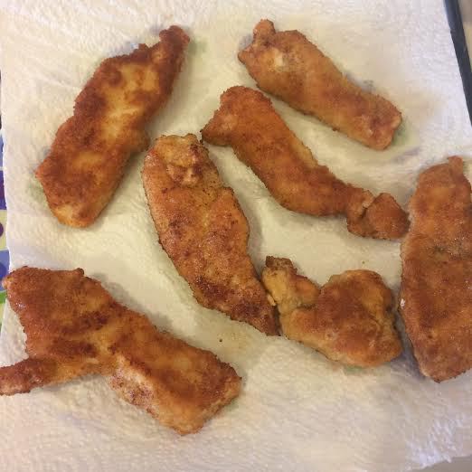 Куриную грудку нарезать на брусочки. Посолить и поперчить.