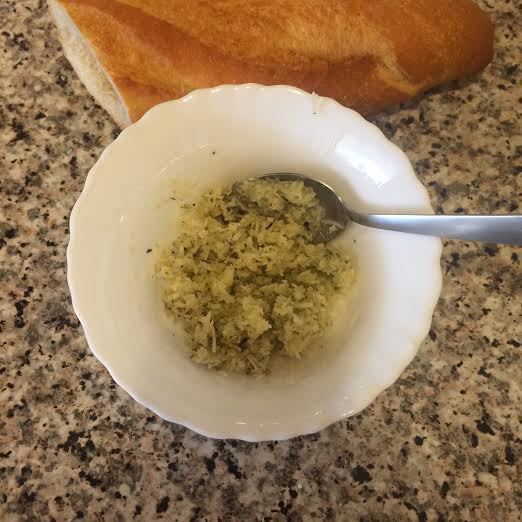 Чеснок выдавить через пресс, пармезан натереть на мелкой терке. В миске смешать пармезан, чеснок и масло.