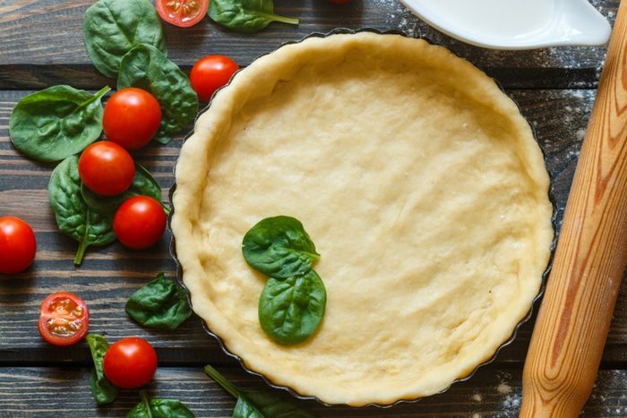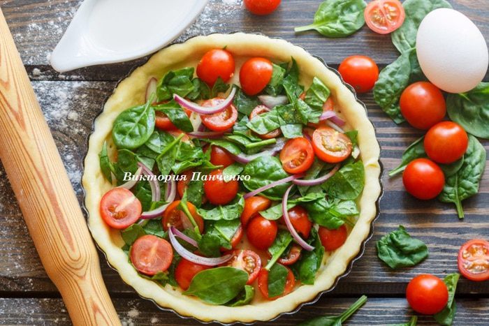 Насыпать в чашку муку, натереть сливочное масло, добавить соль и сахар, крахмал и разрыхлитель. Перетереть в крошку. Добавить яйцо и молоко, замесить тесто. Накрыть полотенцем или затянуть пленкой и оставить на 30 минут. Раскатать из теста лепешку и перенести ее в форму для запекания, сформировать бортики. Сделать частые наколы вилкой.